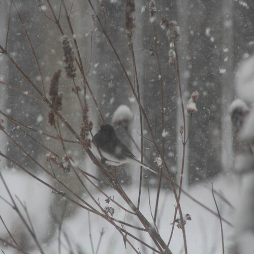 bird perched on a branch during snow stormLastly, a lone bird utilizing some branches as a dry perch. What a peaceful moment to capture in the midst of heavy snow. If you’re looking to see more of Caroline’s garden, be sure to check out her blog: Carogil Farm.