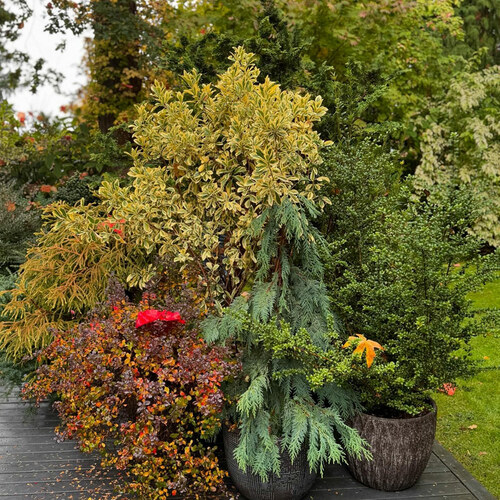 Another show-stopping conifer in a pot that matches the one potted with an umbrella pine, above. This is potentially a ‘Elegans’ Japanese cedar (Cryptomeria japonica, Zones 6–9).