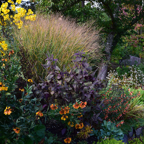 Eighth is a vignette in the garden that includes Heavy Metal Switch grass (Panicum virgatum ‘Heavy Metal’, Zones 4–9), annual purple perilla, and ‘Mardi Gras’ sneezeweed (Helenium ‘Helbro’ , Zones 4–8).