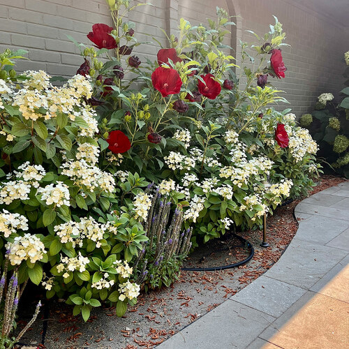 Switching gears, the second property the Mandi shared appears to have some more space and a more refined style. High-contrast colors keep the design exciting, even when the plant palette is more limited and beds aren’t so densely planted. The deep, dark foliage of heucheras and what looks to be a meticulously maintained Black Lace® elderberry (Sambucus nigra ‘Eva’, Zones 4–7) are complimented perfectly by the white flowers that surround.